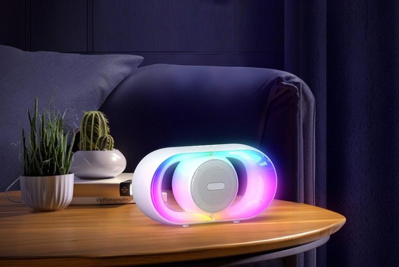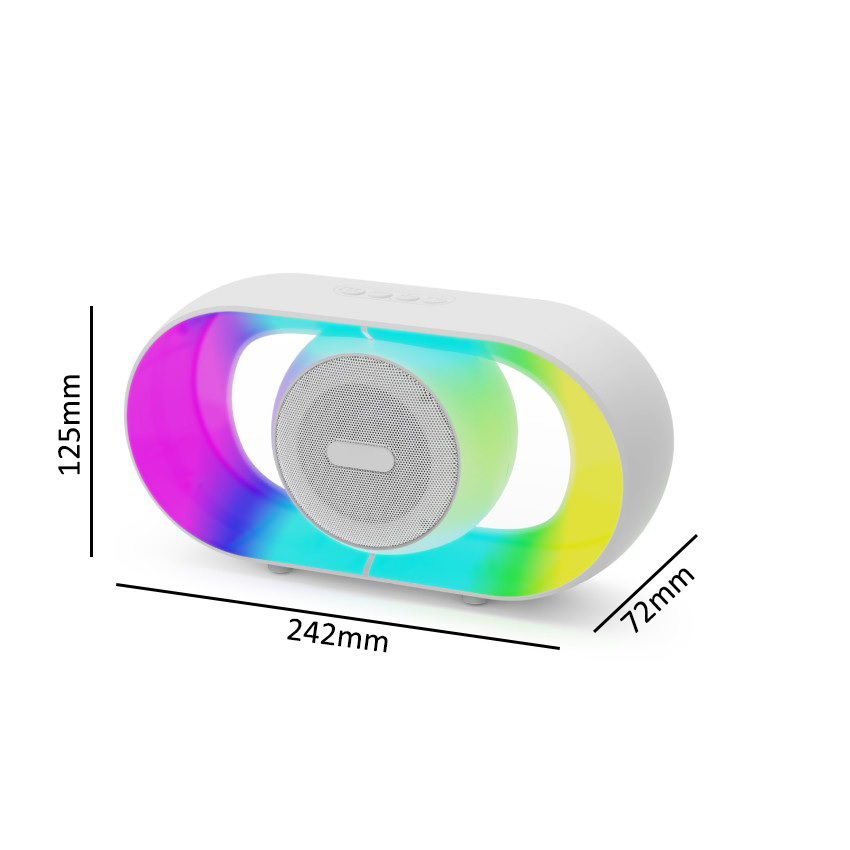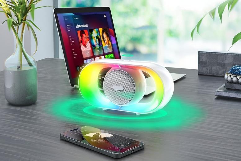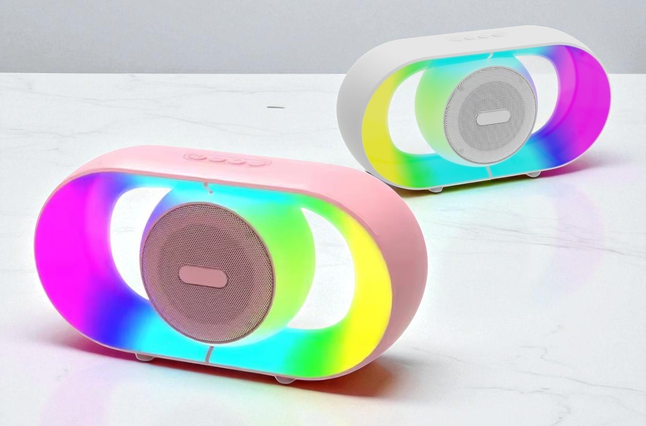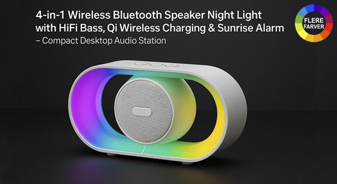 Forvandl dit hjem med kraftfuld lyd, levende lys og nem opladning – alt samlet i én elegant bord-enhed. Uanset om den står på natbordet, skrivebordet eller hylden på kollegieværelset, fungerer den som farverig LED-natlampe, digitalt solopgangsvækkeur, Qi-kompatibel trådløs oplader og Bluetooth-højttaler – samtidig med at den fylder mindre end 15×15 cm.