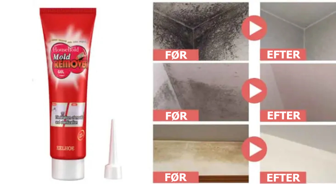 - Tryk gelen ud som tandpasta, når du påfører den – dæk skimmelen uden at udjævne. Undgå at smøre den tyndt ud, da det påvirker skimmelfjernelsen.