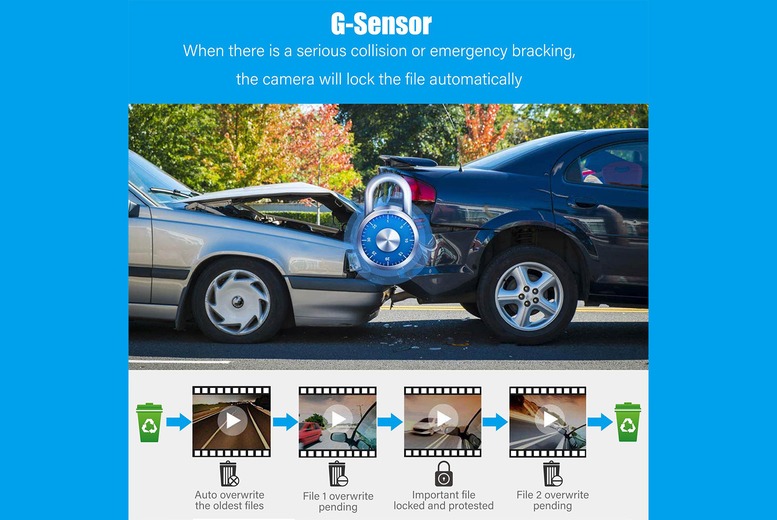 Den indbyggede G-sensor gemmer automatisk optagelser ved kollisioner eller pludselige strømafbrydelser.