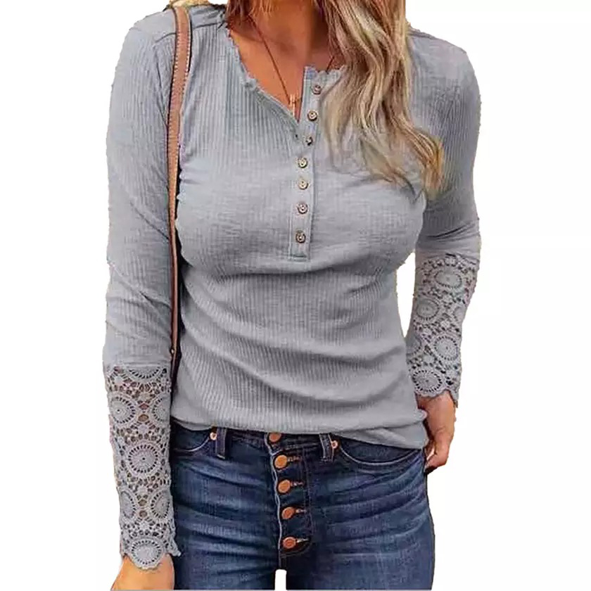 1 stk. dame-T-shirt med rund hals, syninger, blondeærmer og løs pasform, ensfarvet og langærmet
