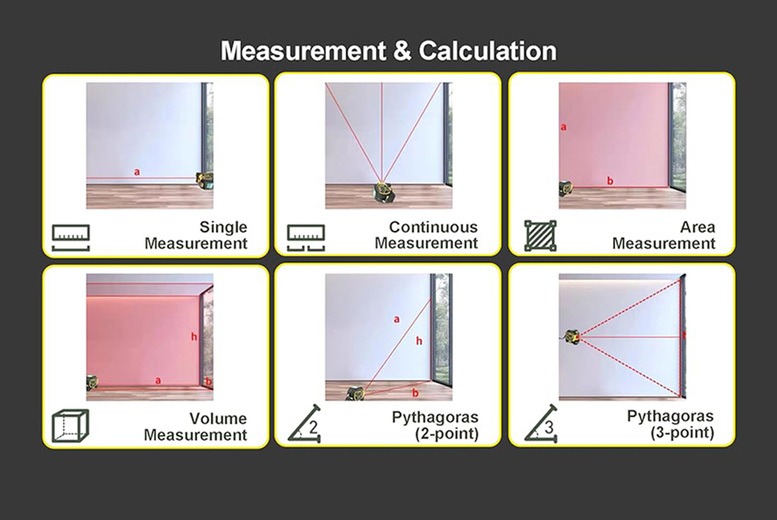 - Fyldt med alsidige funktioner – enheden understøtter både enkeltmålinger og kontinuerlige målinger, beregning af areal og volumen samt Pythagoras-målinger til de specielle vinkler.