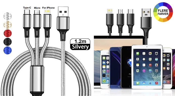 Med dagens deal får du et nylonflettet 3-i-1 opladningskabel. Oplad hurtigt og nemt med vores slidstærke, nylonflettede kabel, der kombinerer tre stik i ét. Perfekt til mobil, tablet og andre enheder – derhjemme, på arbejdet eller på farten.