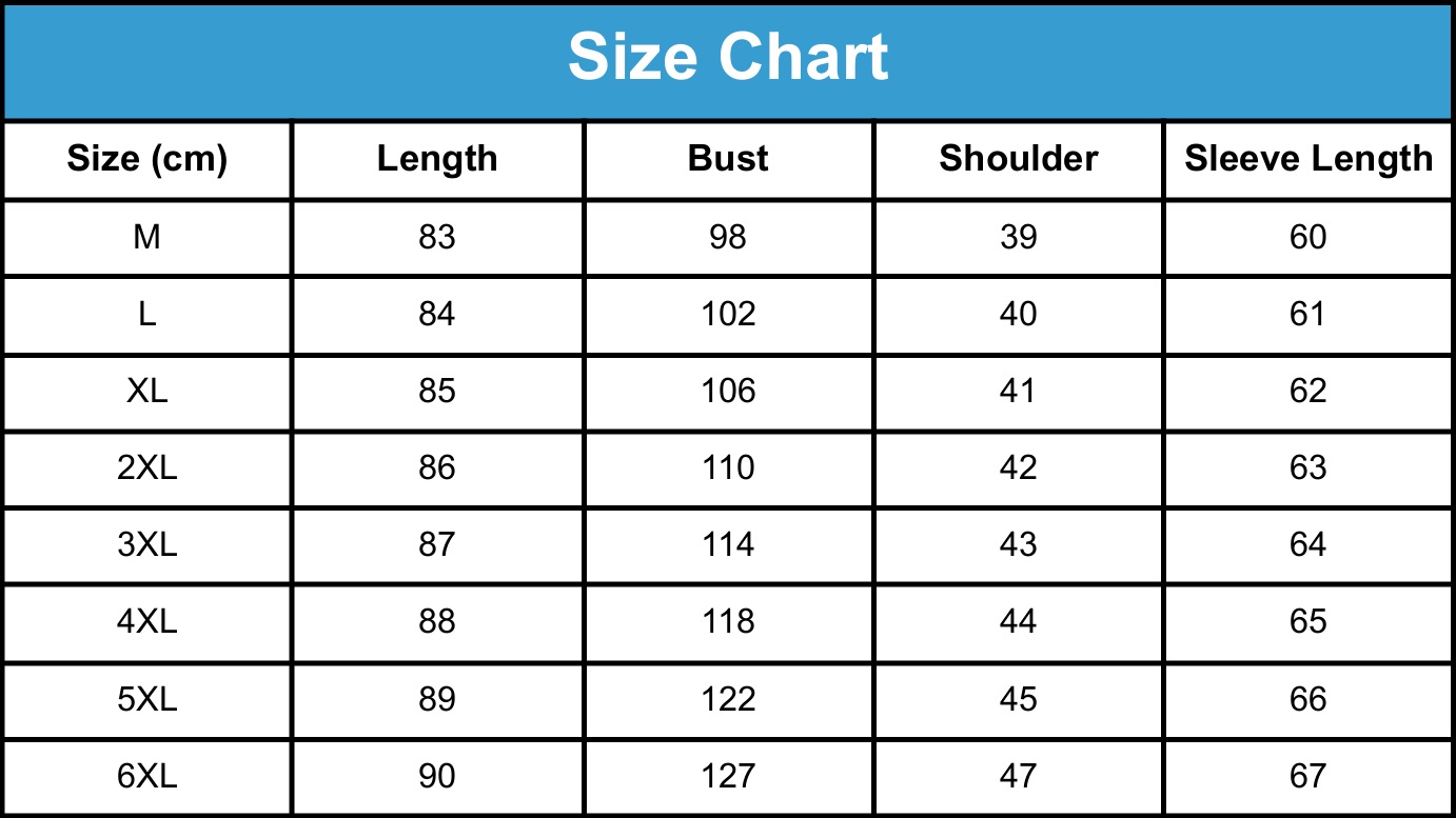 - Størrelser: M, L, XL, 2XL, 3XL, 4XL, 5XL, 6XL