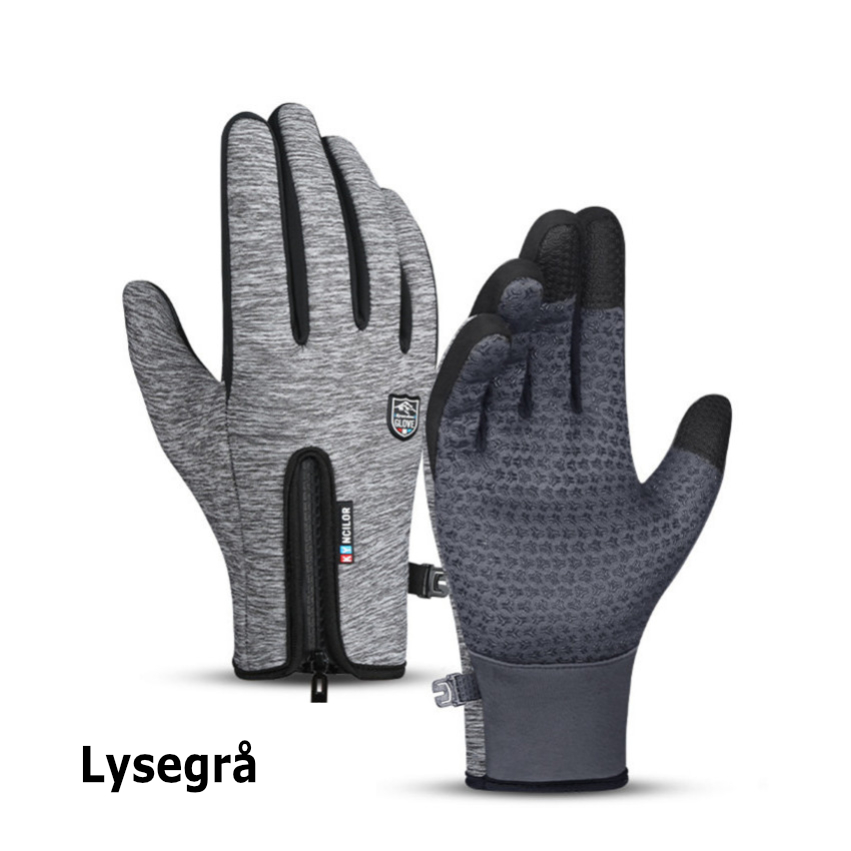 Vandtætte, foret og skridsikre handsker med touch, så mobiltelefonen kan bruges sammen med handskerne – fås i flere størrelser og farver.