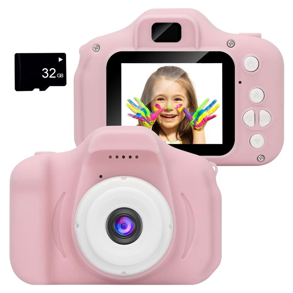Digitalkameraet kan både tage billeder og optage videoer og er designet til børn, så det er nemt at håndtere. Der er endda et indbygget spil i kameraet til højre.